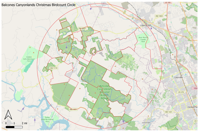 The census area includes all the tracts of the Balcones Canyonlands NWR and the surrounding area. We need many birders of all skill levels to adequately survey the species and numbers of these species in the count circle. We would especially like to have some feeder watchers this year, so if you live within the area of the refuge and have bird feeders, please participate.